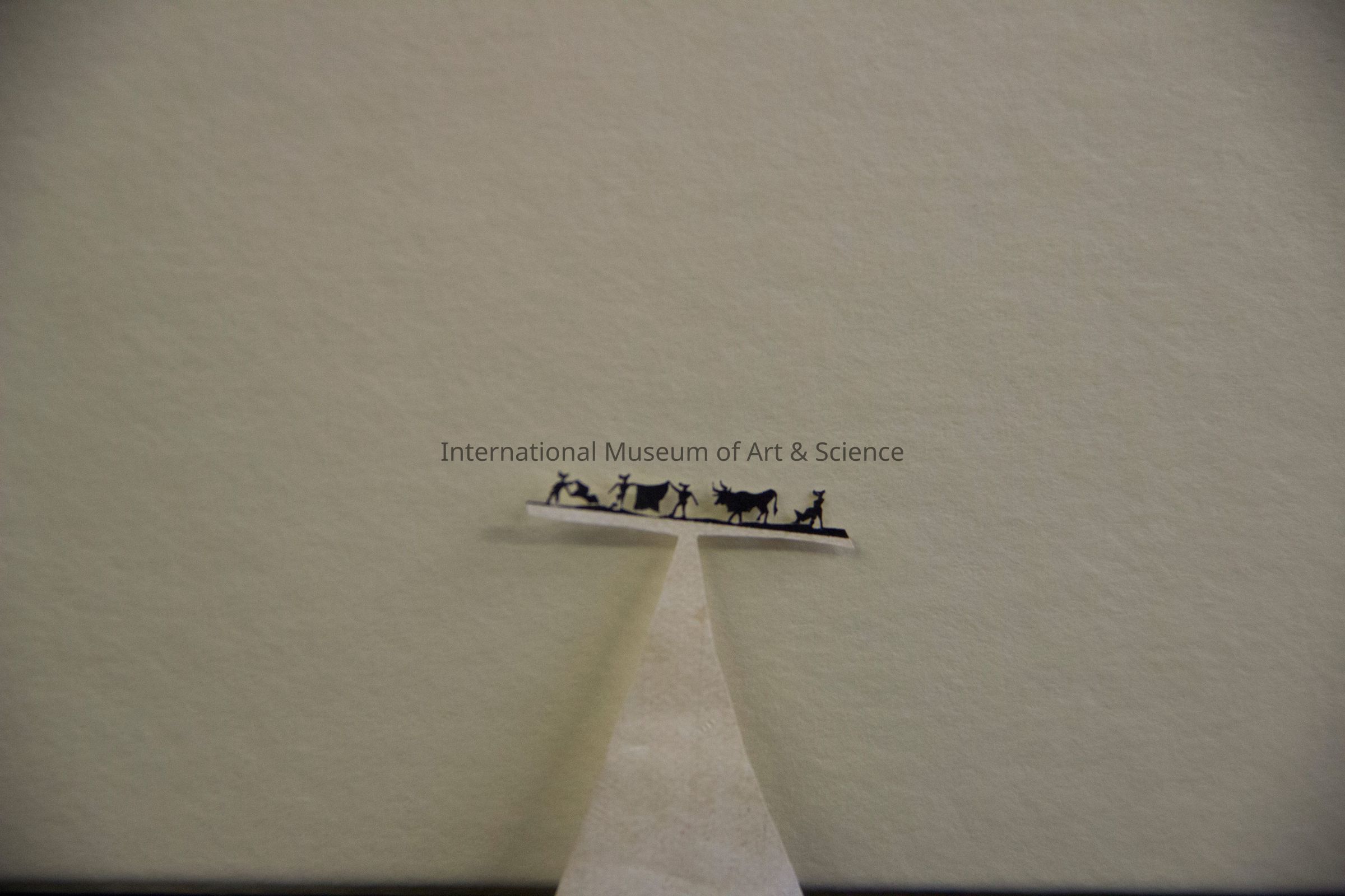 A miniature paper cut-out. The triangular base supports a horizontal bar that depicts a bull fight scene. In silhouette form, one can see a bull fighter waving his cape before the bull, two picadores holding up their capes, and another figure behind the raging bull.