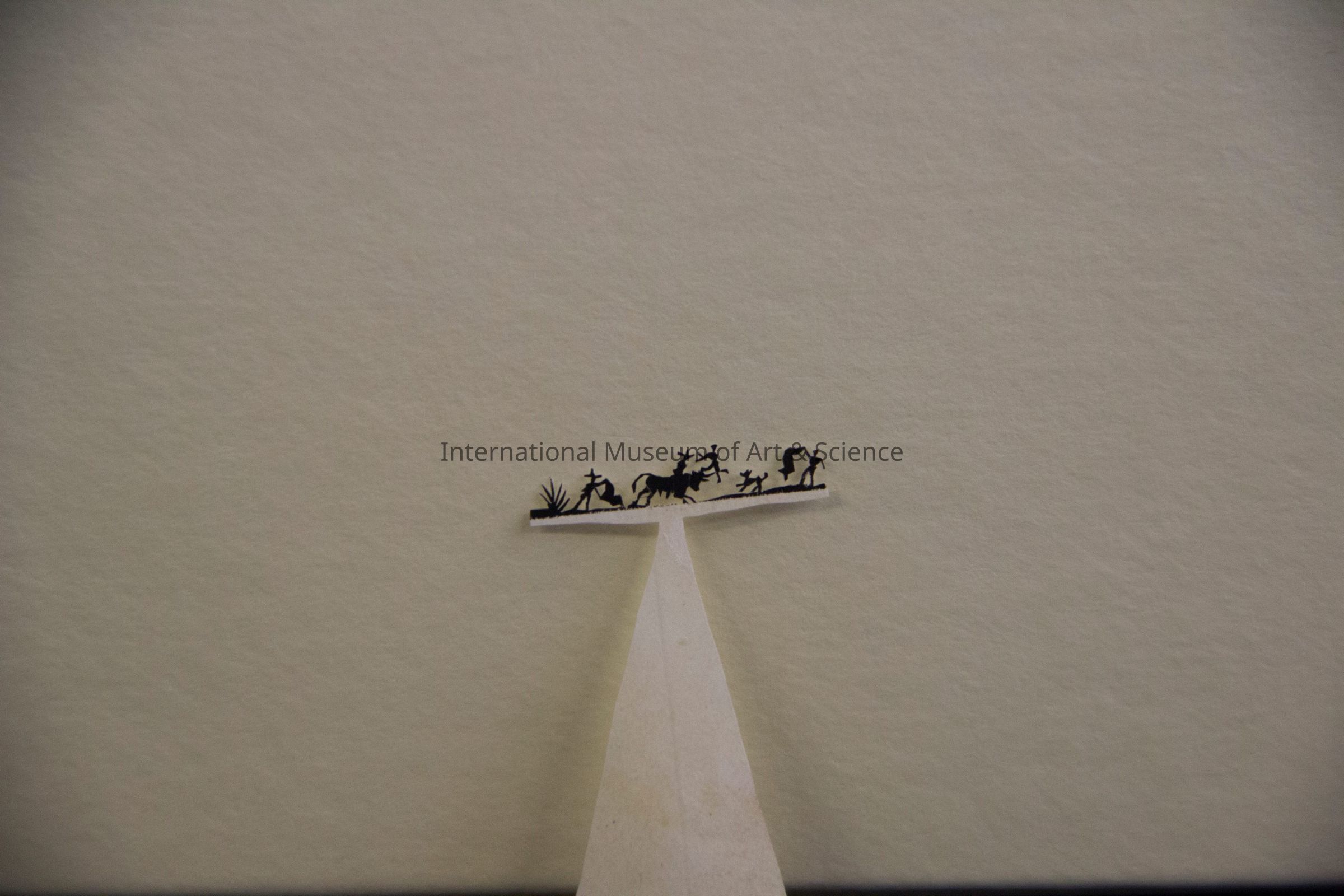 A miniature paper cut-out. The triangular base supports a horizontal bar that depicts a bull fight scene. In silhouette form, one can see the bull fighter waving a cape, and old bull carrying two Picadores and a dog.