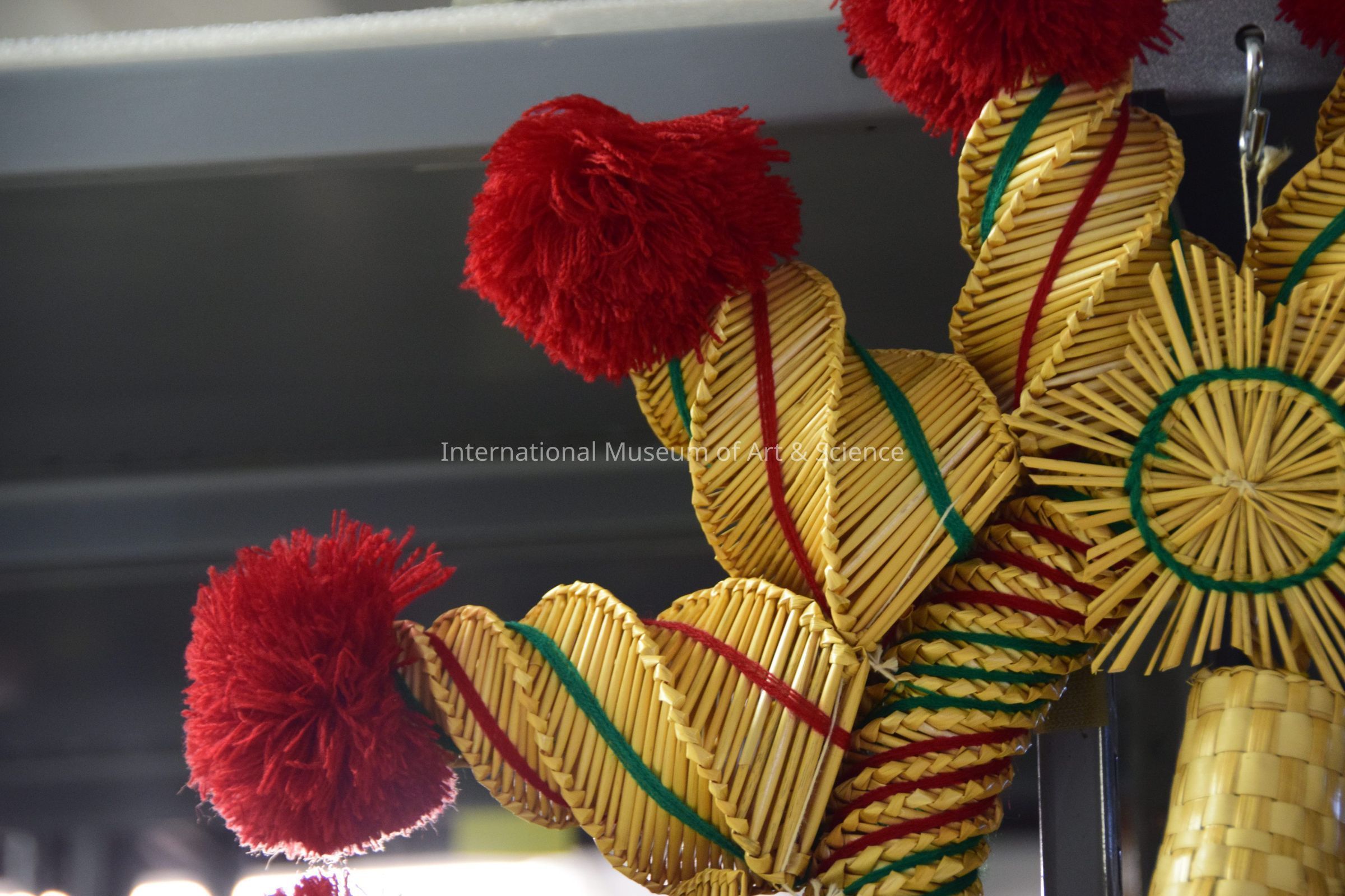 Straw wreath with tasseled points; basic tubular woven wreath with bell attached to it by flat star; connected around the exterior of the wreath are 3-D, spiraling cones that make up the points of the wreath; the cones ends in large red, tassels; red, green acrylic yarn are wrapped around the lower spaces created by the ridged spiral; natural wheat straw color.Artwork Details
