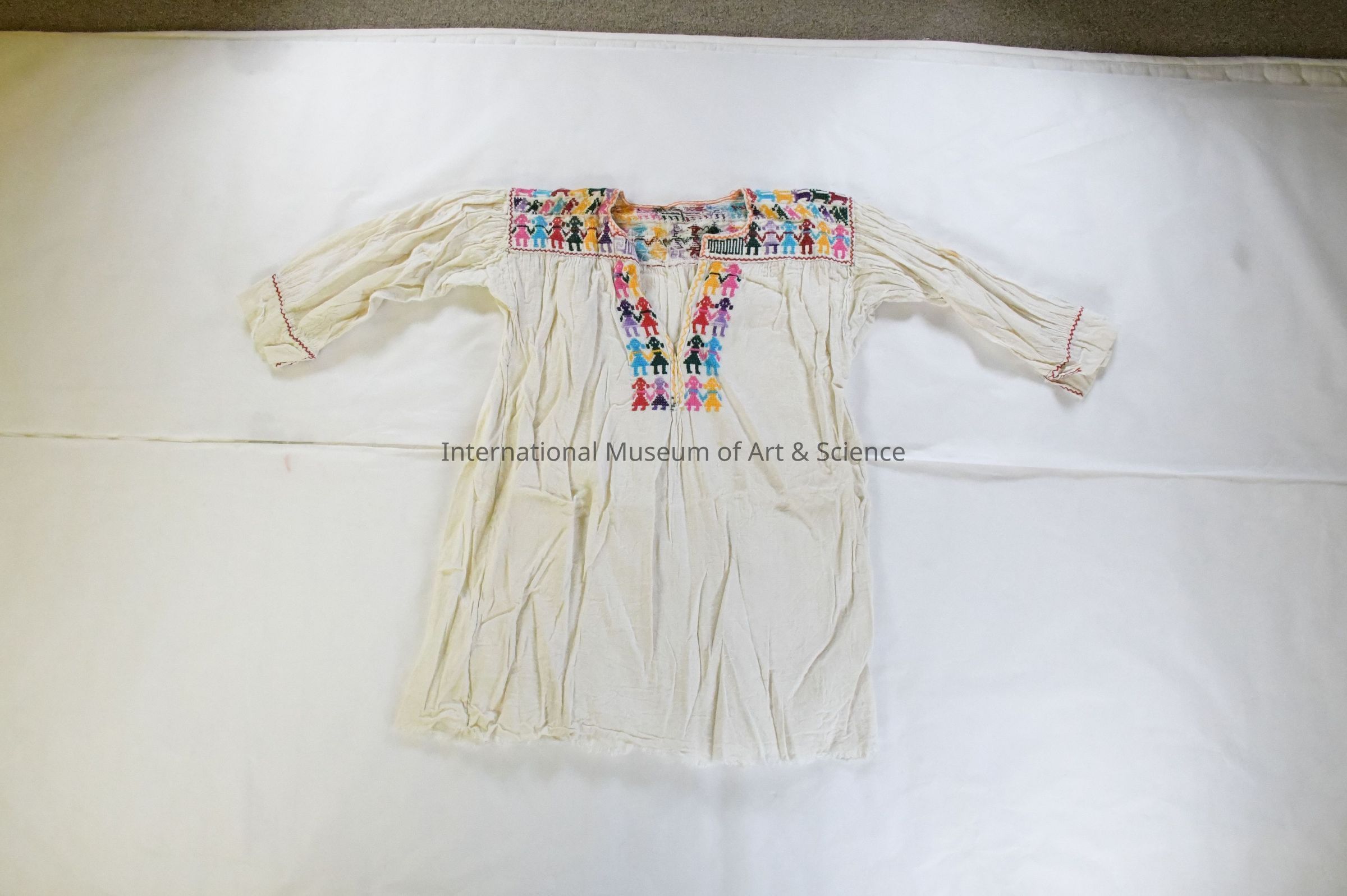 This Zapotec girl's blouse features traditional handwoven cotton muslin (manta), soft and lightweight, suitable for the warm climate of Oaxaca. The garment is designed with a wide yoke heavily adorned with multicolored cross-stitch embroidery depicting human figures, likely young girls, in alternating colors. This design continues down the center front, framing the neckline and extending vertically to mid-chest. The sleeves are gathered with fine smocking at the shoulders and cuffs, finished with red zig-zag stitching. The blouse is machine-assembled, yet retains high craftsmanship in its hand-finished embroidered details. The lower hem is plain with frayed selvage edges.Ethnography