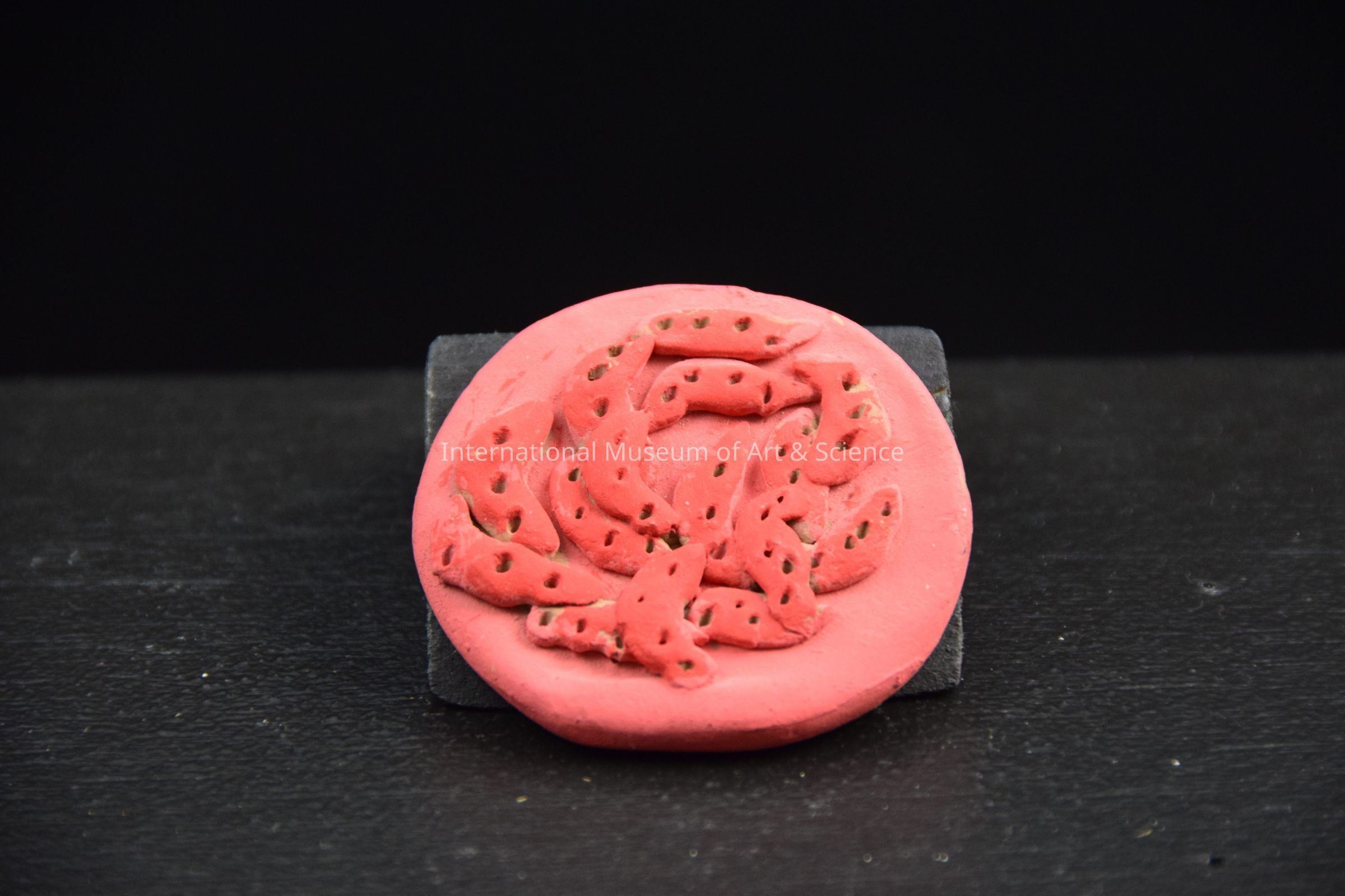 A ceramic plate in the miniature. The plate is painted pink/red and the food in the center is red. "MEXICO" is staped on the underside. It is part of a 28 piece park scene.