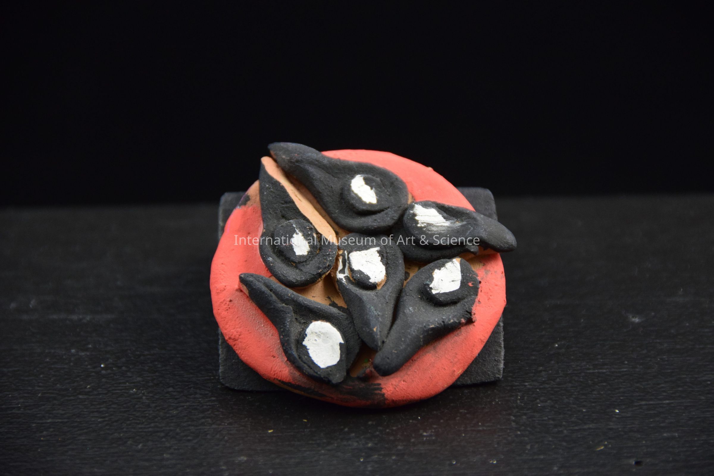 A ceramic plate in the miniature. The plate is painted pink/red and the food in the center is red. "MEXICO" is staped on the underside. It is part of a 28 piece park scene.