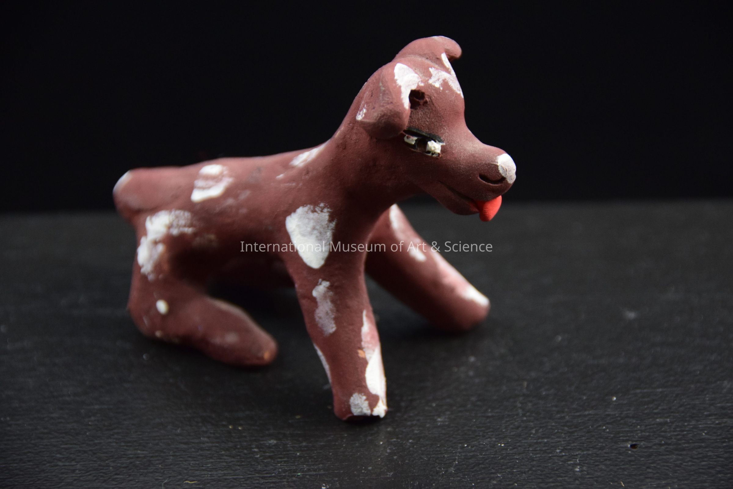 A ceramic figurine of a dog. The dog is painted brown with white spots. Its red tongue is sticking out. It is part of a 28 piece park scene.Dimensions