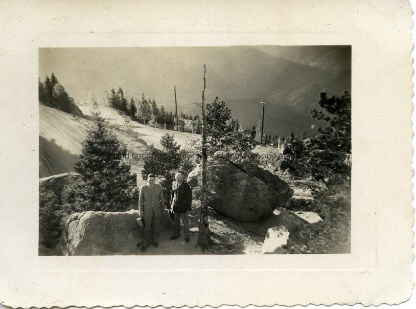 Photograph of two men in Army uniforms standing on a rock looking up at the camera. Back of photograph: Oct 5 1942.