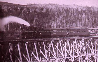 Photograph of a train crossing a lofted wooden railway. Likely c. early 1900s.