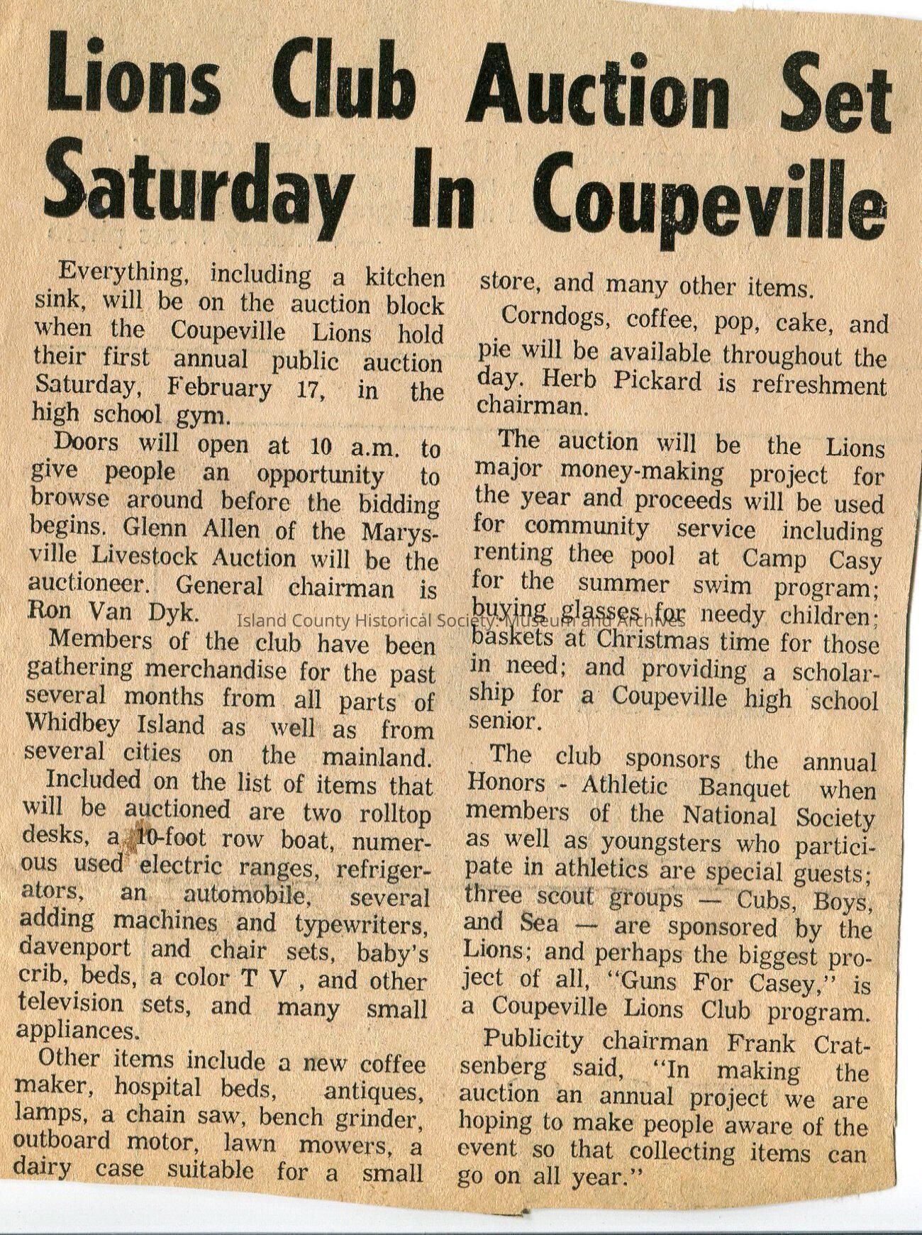 Digital copy only of a newspaper clipping, "Lions Club Auction Set Saturday In Coupeville". The article describes the upcoming first annual Lions Club auction set for Saturday, February 17 (year unknown) at the Coupeville High School gym. Ron Van Dyk was the General Chairman.
