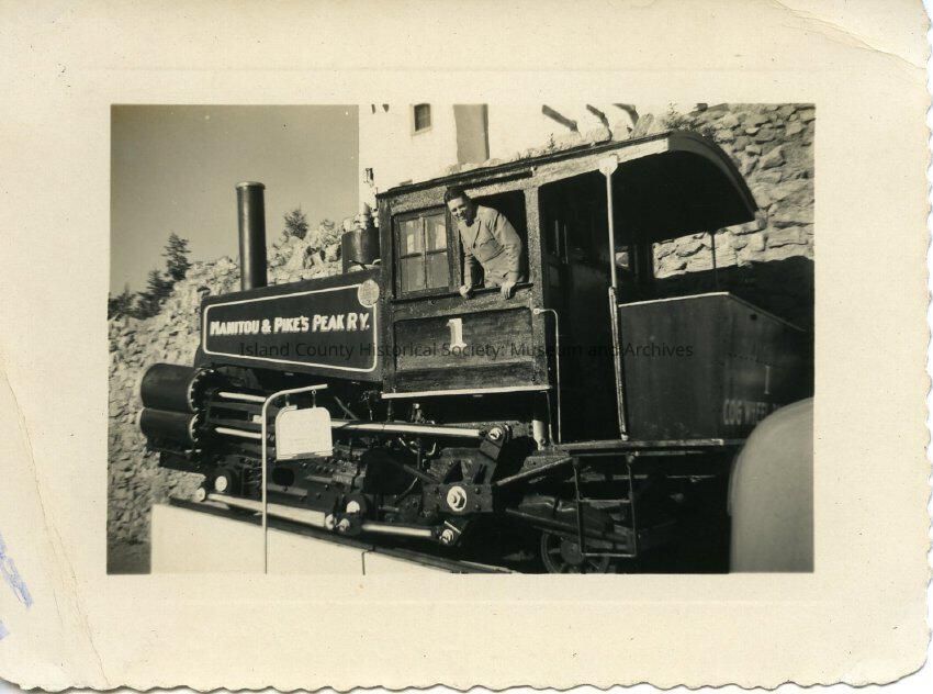 Photograph of a man riding the Manitou & Pike's Peak R. Y. train. Photo stamp on the back: Oct 5 1942.