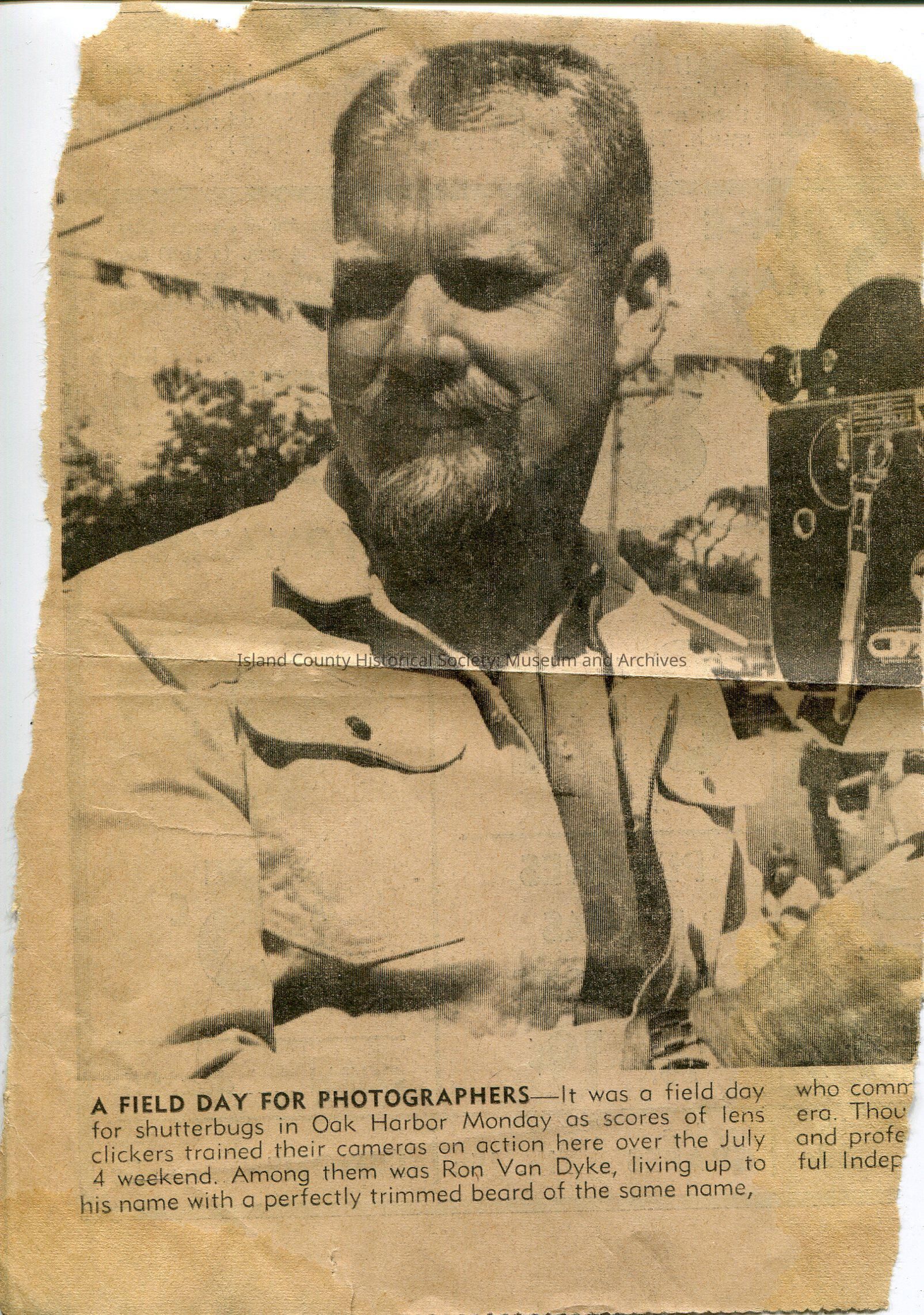 Digital copy only of a black & white newspaper photo of Ron Van Dyk at a July 4th weekend celebration. He is wearing a long sleeve shirt and has a beard. No year or description.