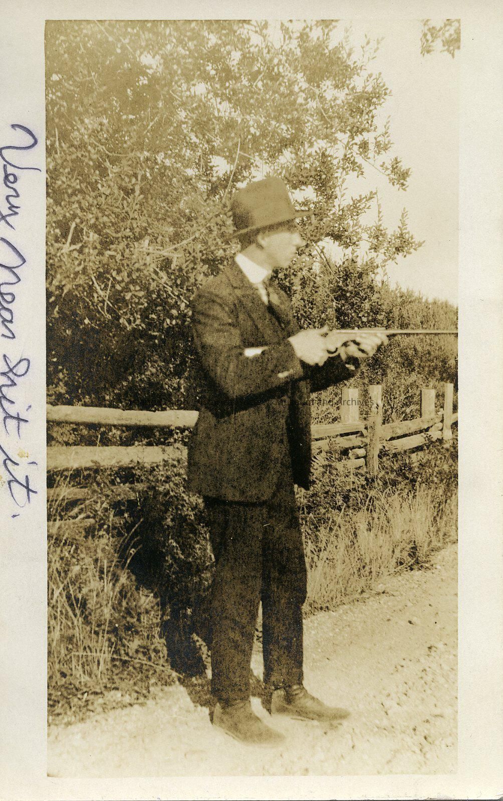 A photo of a man dressed in suit holding a rifle along a fence. The handwritten words on front say "Very Near Hit It."