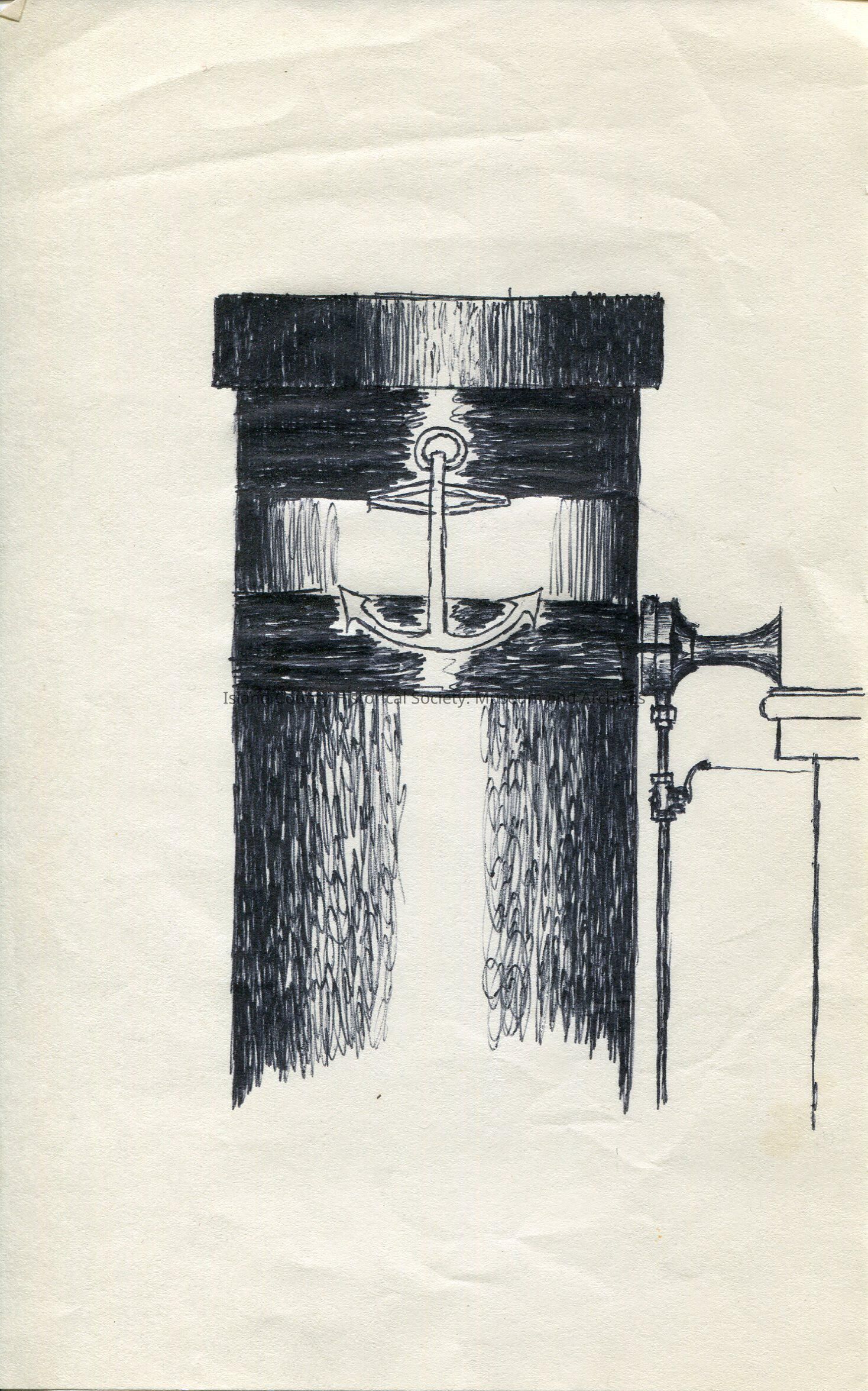 Digital copy only of a black & white sketch of a steamboat stack with an anchor drawn on top of it. On the right side of the stack is the horn.Lexicon