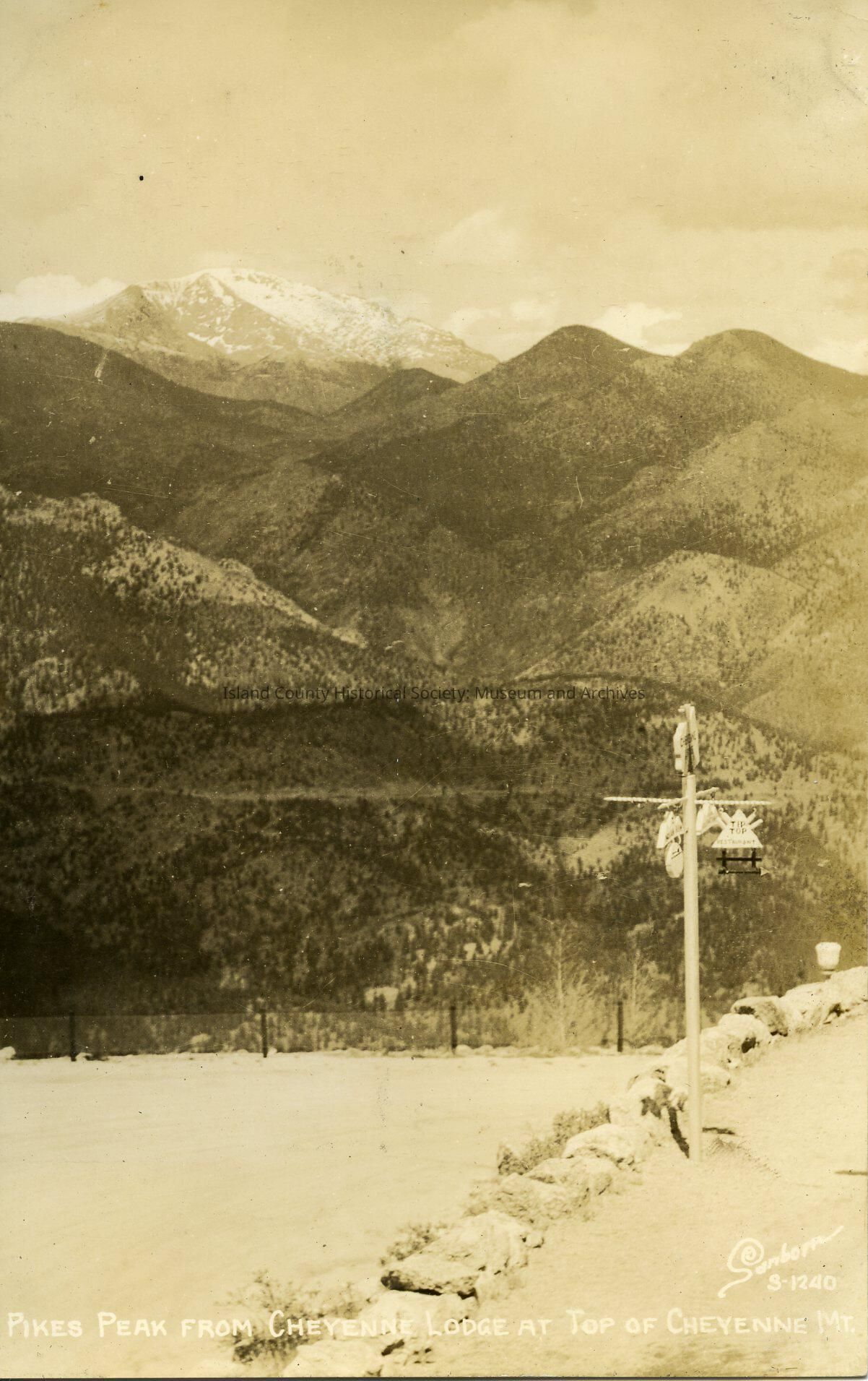 Bottom of the photo says, "Pikes Peak From Cheyenne Lodge at Top of Cheyenne Mt.". The top 3/4 of the photo is of Pikes Peak/mountains and the bottom 1/4 of the photo is the road, fence and a telephone pole.