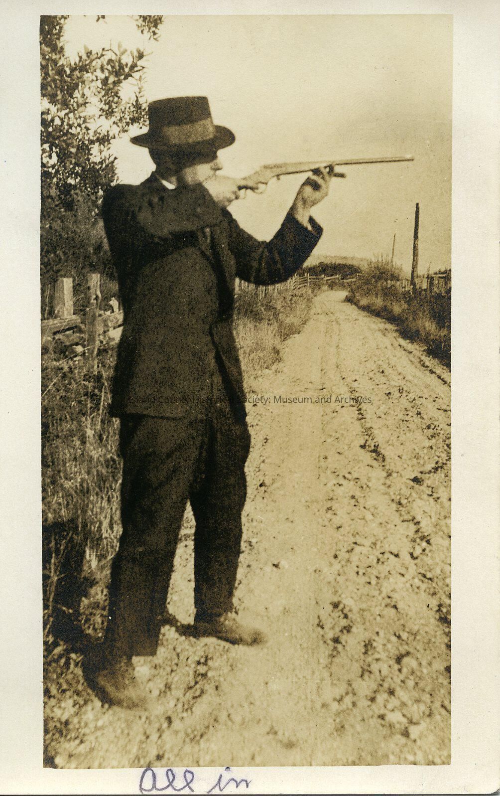 A photo of a man in a suit standing outside, with a rifle. Handwritten on the front is "All In." AZO Postcard: 1904-1918