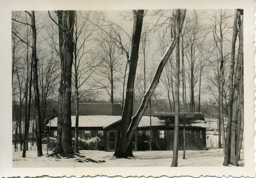A black and white photo of a house covered in snow. The area around the house is somewhat wooded. There is about 2-3 inches of snow on the ground. There are no people or other houses visiable in the photo.