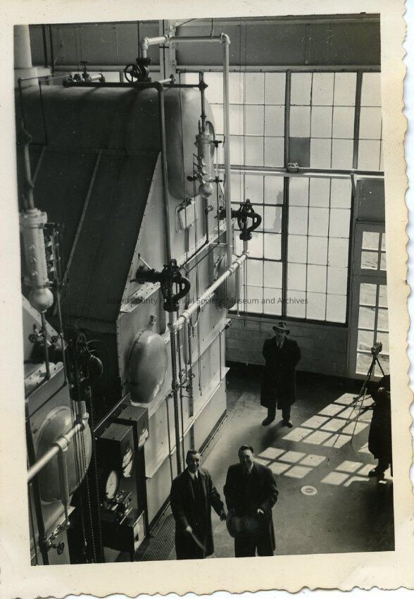 A black and white photo of four men standing around a camera, filming inside of an industrial building. The left side of the photo is of a large machine that almost reaches the ceiling. The right side of the photo is of the men who are all wearing suits, jackets and have hats.