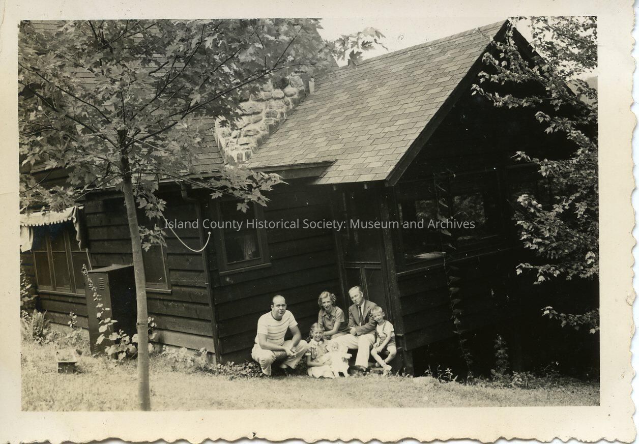 A black and white photo of a family of five in front of a house. They are sitting on the porch in the front of the door. There is one small tree on the left side of the photo. The little girl in the photo is holding a doll.