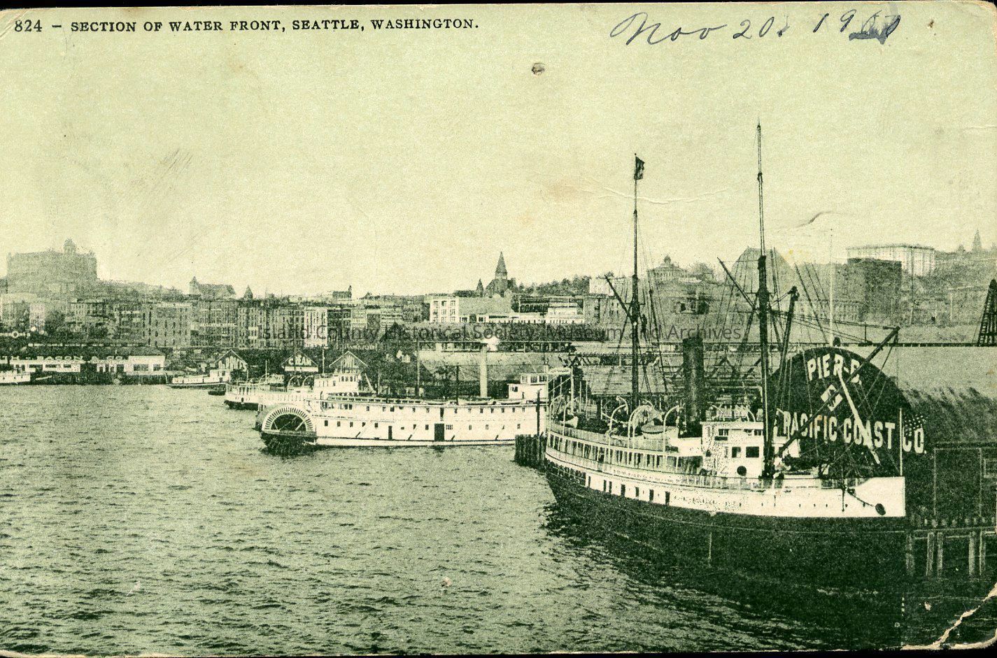 Postcard depicting a section of Seattle's waterfront, dated November 20, 1907. The ship located in front of the Pacific Coast Co. building is the "City of Topeka". The steamboat directly behind it (note the large steam wheel at the back of the boat) is the "State of Washington". The postcard is addressed to Minnie Wilson, Seattle, Washington.Collection