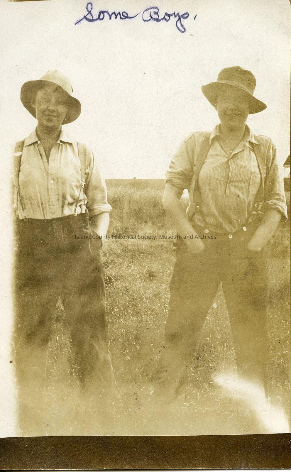 A photo of two people standing outside. Handwritten on the front is "Some Boys".Made/Created