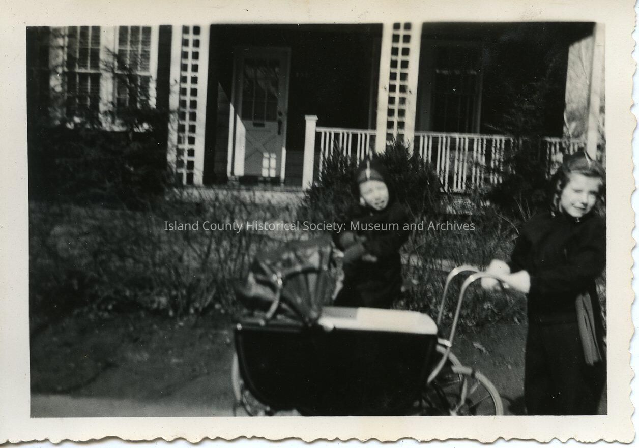 Black and white photo of two children playing in front of a house. There is a boy and a girl and they are both wearing winter clothing. The girl is pushing a carriage. There is no snow on the ground but the trees are bare. Only the porch and front door from the hosue in the background are visiable. The photo is a little blurry. John and Robin Kellogg in Evanston, IL ca, 1942.