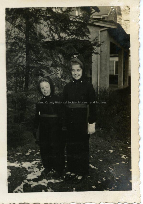 A black and white photo of two children standing near a house. There is one boy and one girl and both are wearing winter clothing. There is not much snow on the ground. There is a tree and a house or two in the background. John and Robin Kellogg in Evanston, IL ca, 1942.