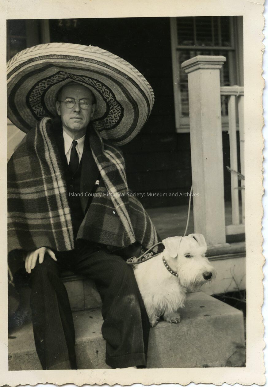 A black and white photo of a man wearing a sombrero and a poncho around his shoulders. There is a small white dog sitting next to the man. The man and the dog are sitting on a porch. The man is wearing a suit under the poncho. George A. Kellogg