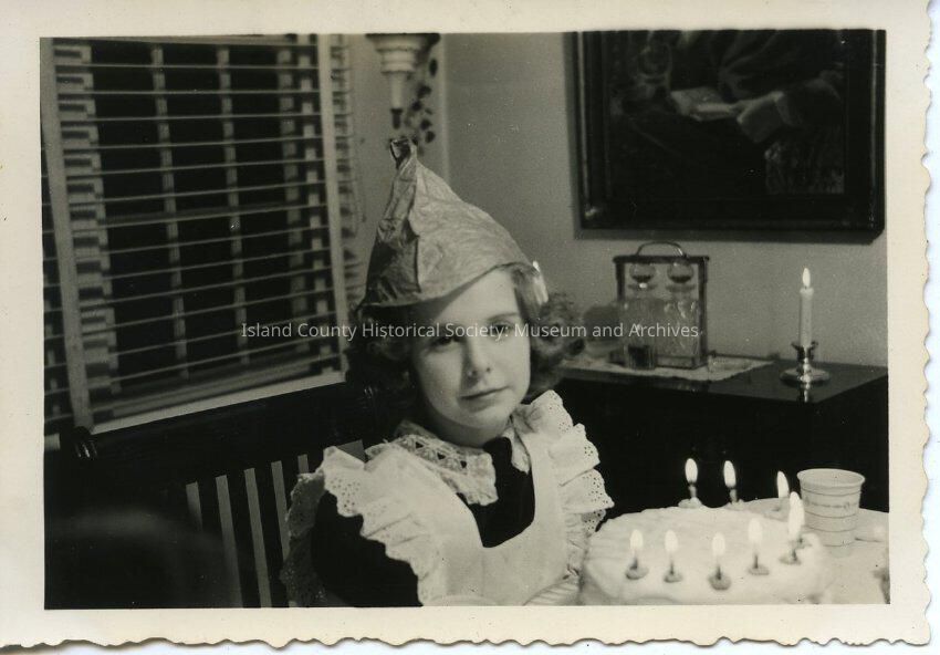 A black and white photo of a young girl on her birthday. The girl is wearing a paper hat and has a white apron on over her dress. She is sitting in front of a birthday cake and the candles are lit. There is a window, a large picture on the wall and a table with a lit candle and a couple decanters on it in the background. Robin Currier (Kellogg)