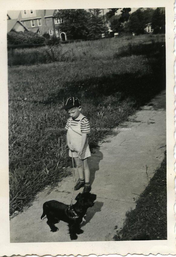A black and white photo of a young boy walking a small black dog on a leash. The boy is wearing a baseball cap and a jumper with a striped shirt. He is looking down. He is walking on a sidewalk and there are a couple houses partically visiable in the back. The background of the photo is mainly grass/a field. John Felton Kellogg