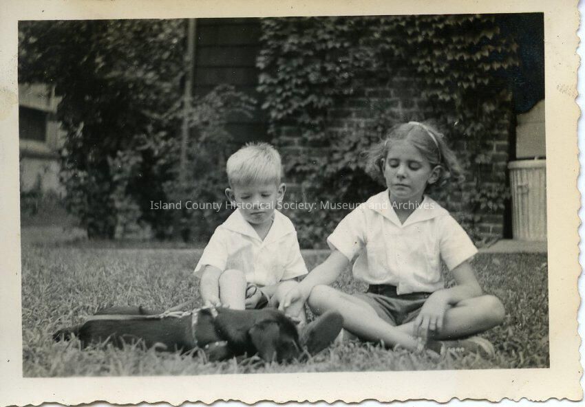 A black and white photo of two young children sitting in the grass with a small black dog. Both children are looking down and petting the dog. Both children are wearing shorts and a white t-shirt. The dog has a harness on it. The background is a house and the brick part of the house is covered in vines. There is also a metal trash can visiable in the back. John Felton Kellogg