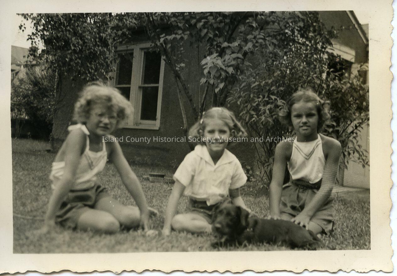 A black and white photo of three young girls sitting in the grass with a small black dog. All three of the girls are wearing summer clothes. The girl on the left side of the photo has glasses. The background is a house and a few small trees.