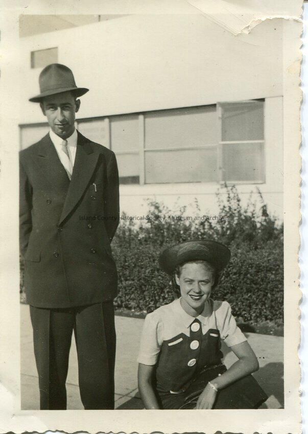 A black and white photo of a couple. The man is standing and is wearing a suit and hat. The woman is sitting on the sidewalk next to him and she is wearing a black and white dress with large buttons and a black hat. Both are looking at the camera and smiling. The background is a building, some bushes and the sidewalk.