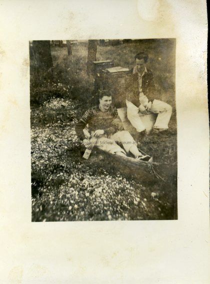 Photograph of a man pretending to paddle a boat. He is sitting in what seems to be a small, coffin-shaped wooden box and holding a short plank of wood in his right hand, pretending to paddle. Another man (right) looks on in amusement. Likely c. 1930s-1940s.