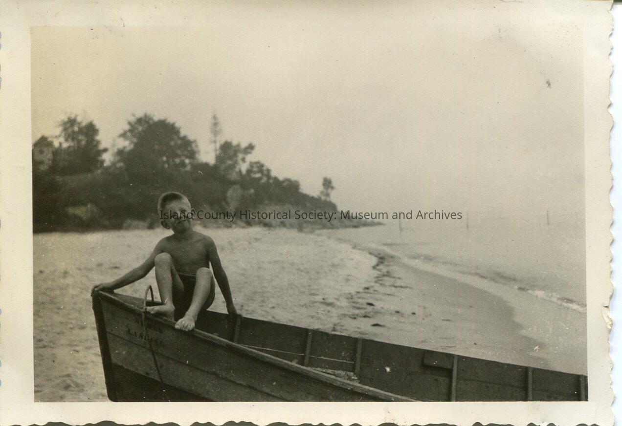 A photo of a young boy sitting on a boat that is beached. The boy is shirtless and is making a face at the camera. The background of the photo is the beach and some trees. The boat is not very big--looks to be about 12 feet long. John Felton Kellogg