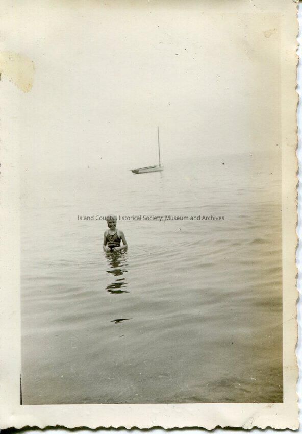 A photo of a young girl in the water smiling at the camera. Behind the girl is a sailboat.
