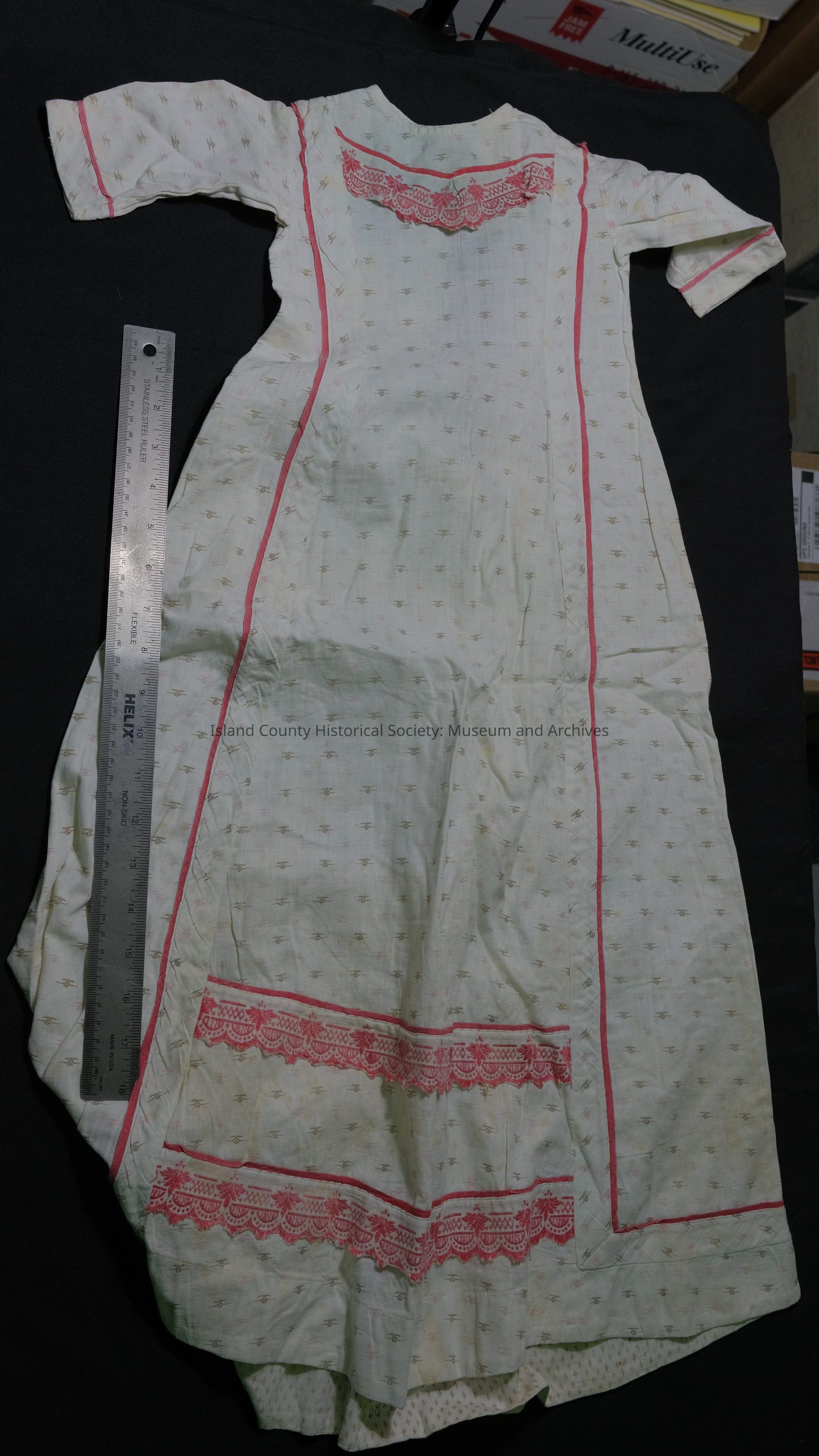 Dress made by Mary A. Drake. Owned by Maude Anna Gilmore.