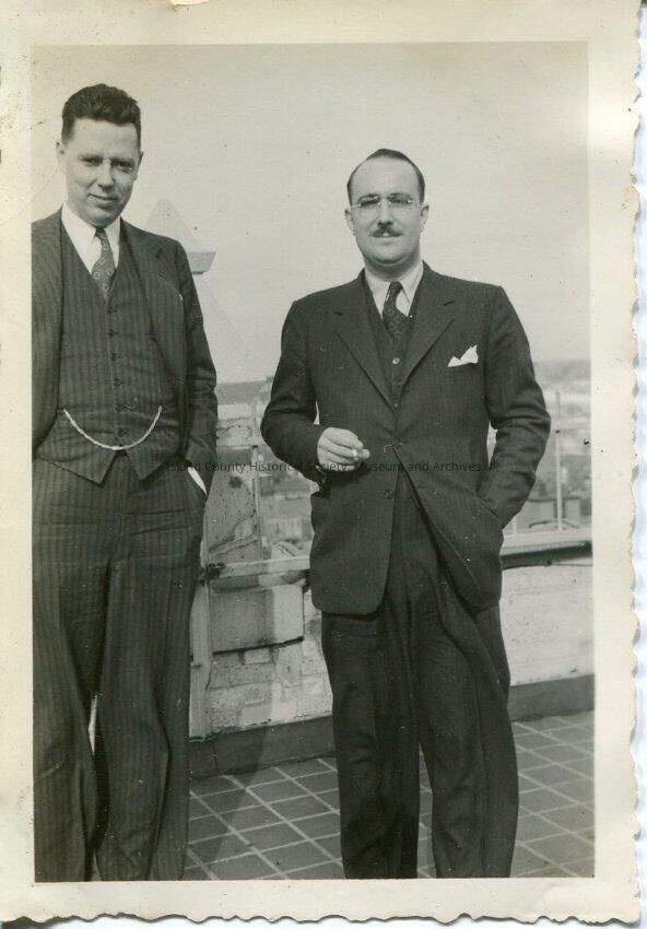 A photo of two men staring at the camera with smiles. They are both wearing suits, the man on the left has both of his hands in his pockets, while the other man has a cigarette in his left hand and the other hand in his pocket.
