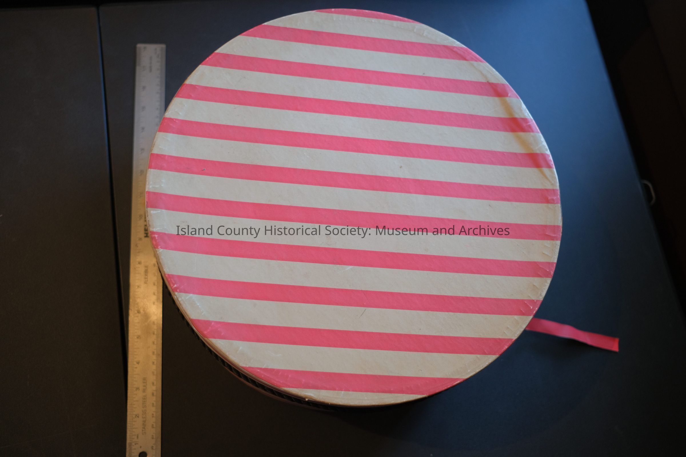 red/white striped hatbox/empty, no brand name