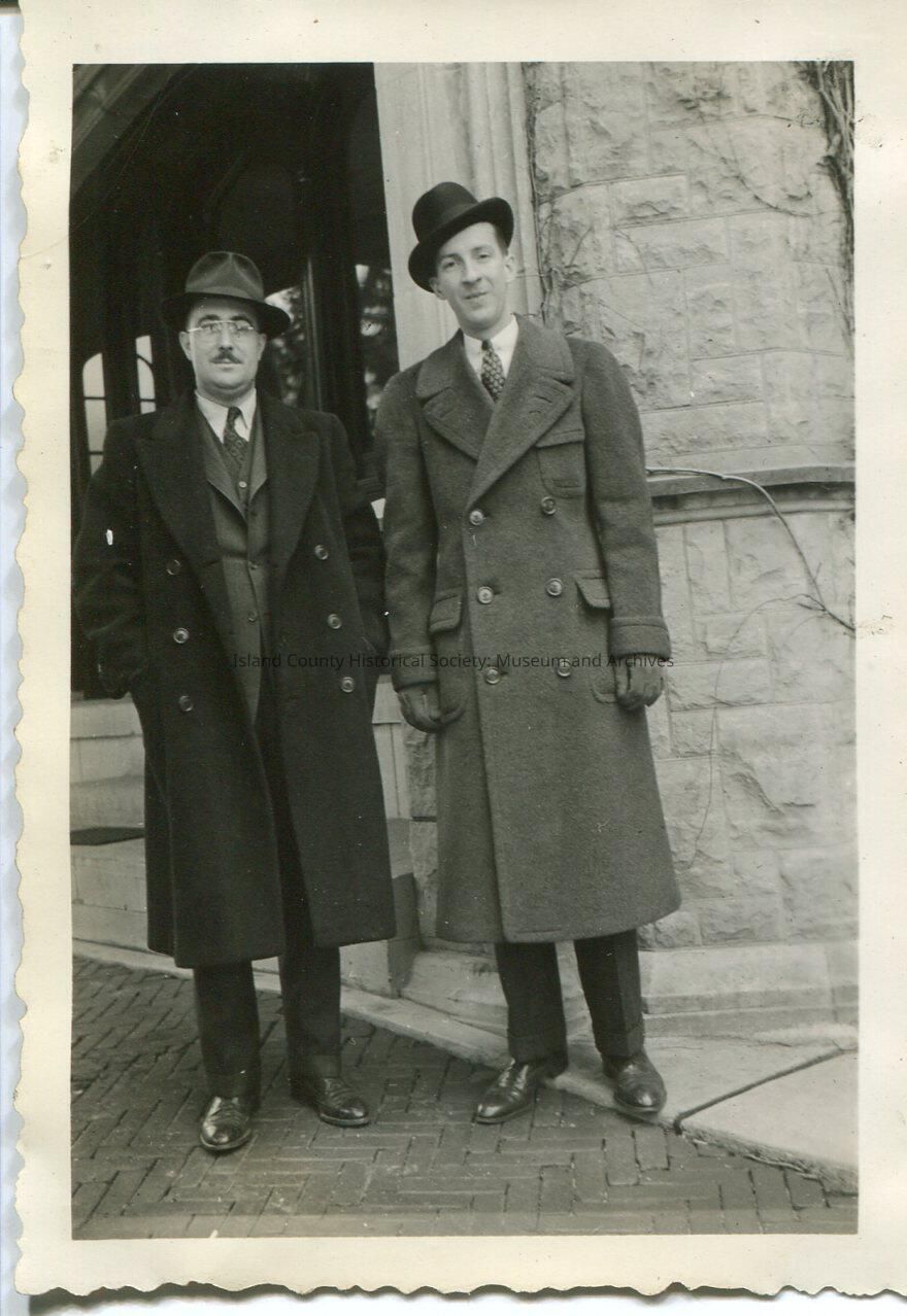 A photo of two men wearing long trenchcoats over their suits. They are both wearing dark hats, the man on the right has his hat tilted to the left and they stand in fromt of a concrete wall.