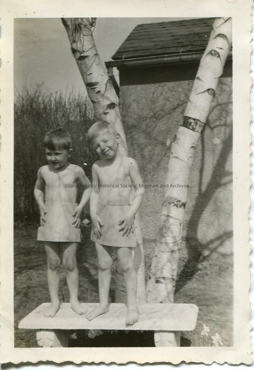 A photo of two young boys standing on a bench smiling at the camera. Both of the boys are wearing towels around their waist. There is a large tree with a building behind them. John Felton Kellogg