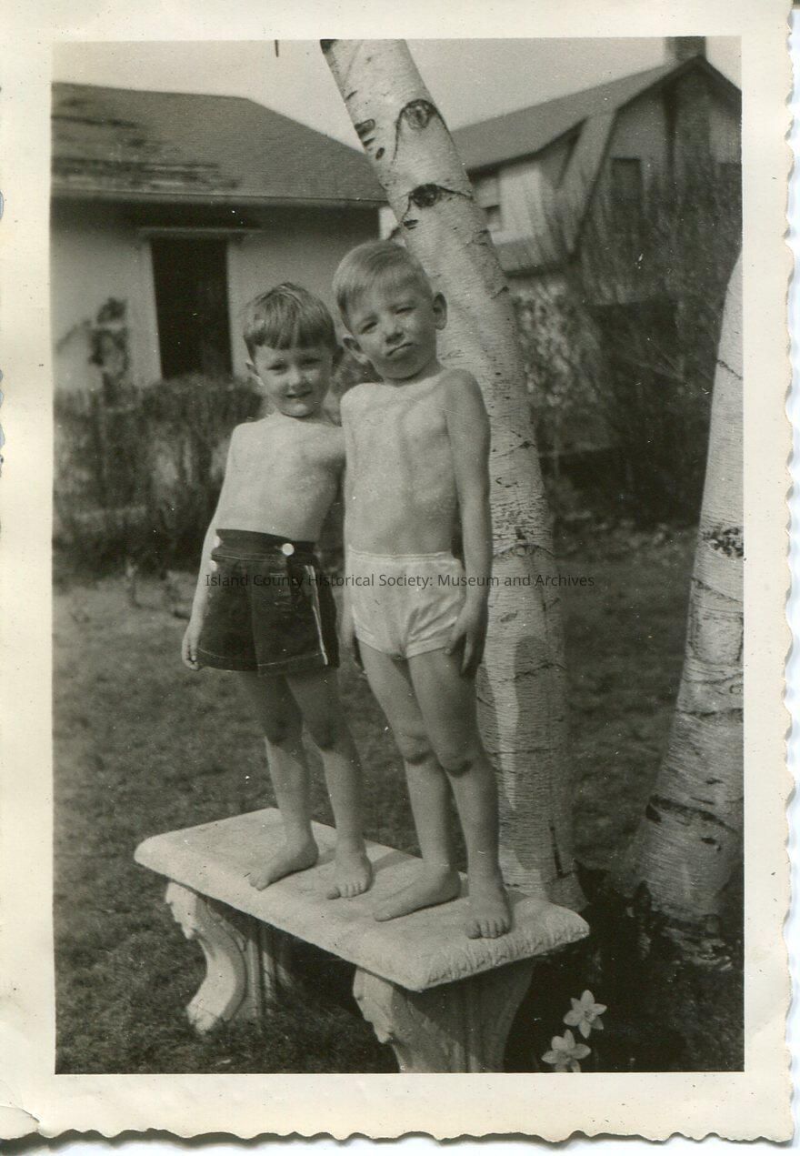 A photo of two young boys standing on a bench smiling at the camera. Both of the boys are wearing swimming shorts. John Felton Kellogg