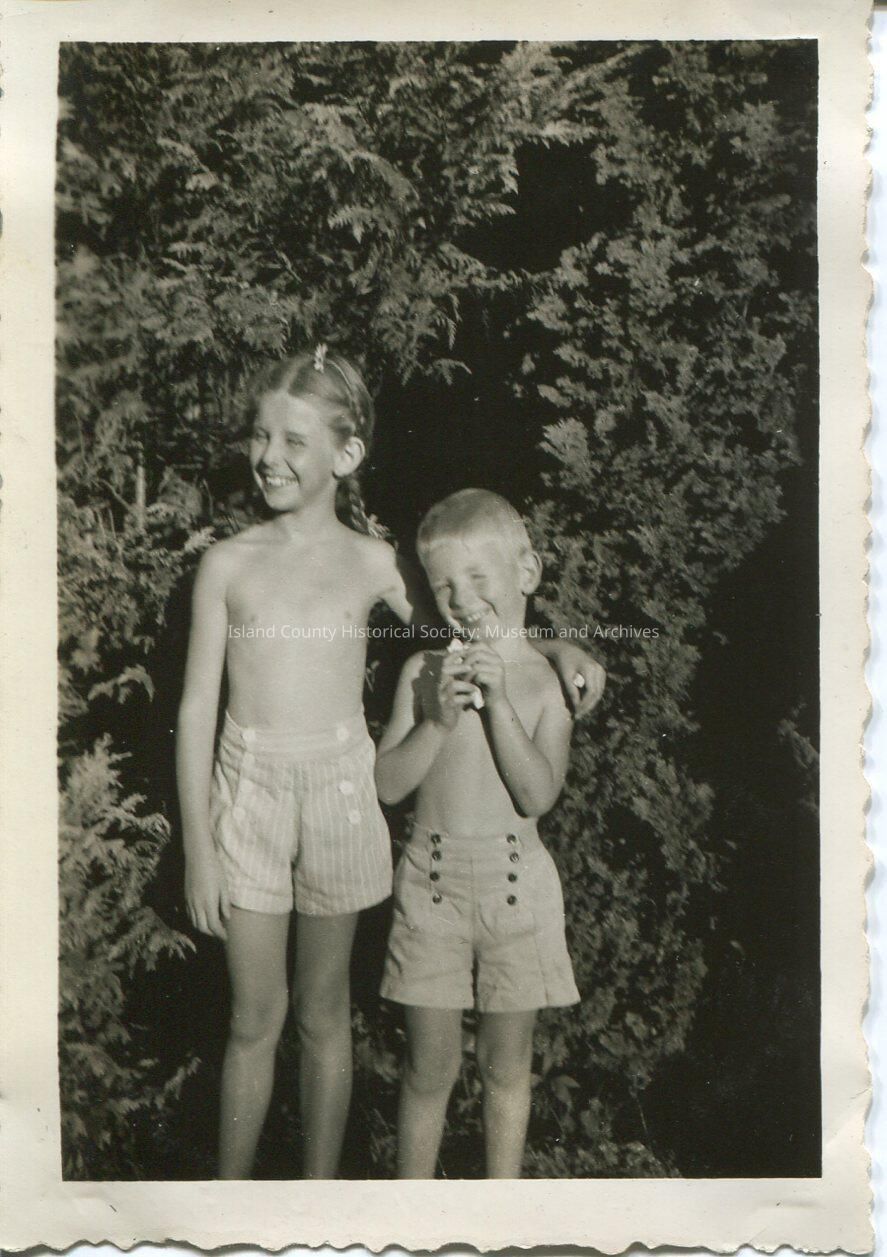 A photo of two young kids standing side by side smiling at the camera. They are both standing in front of a large shrub. John Felton Kellogg