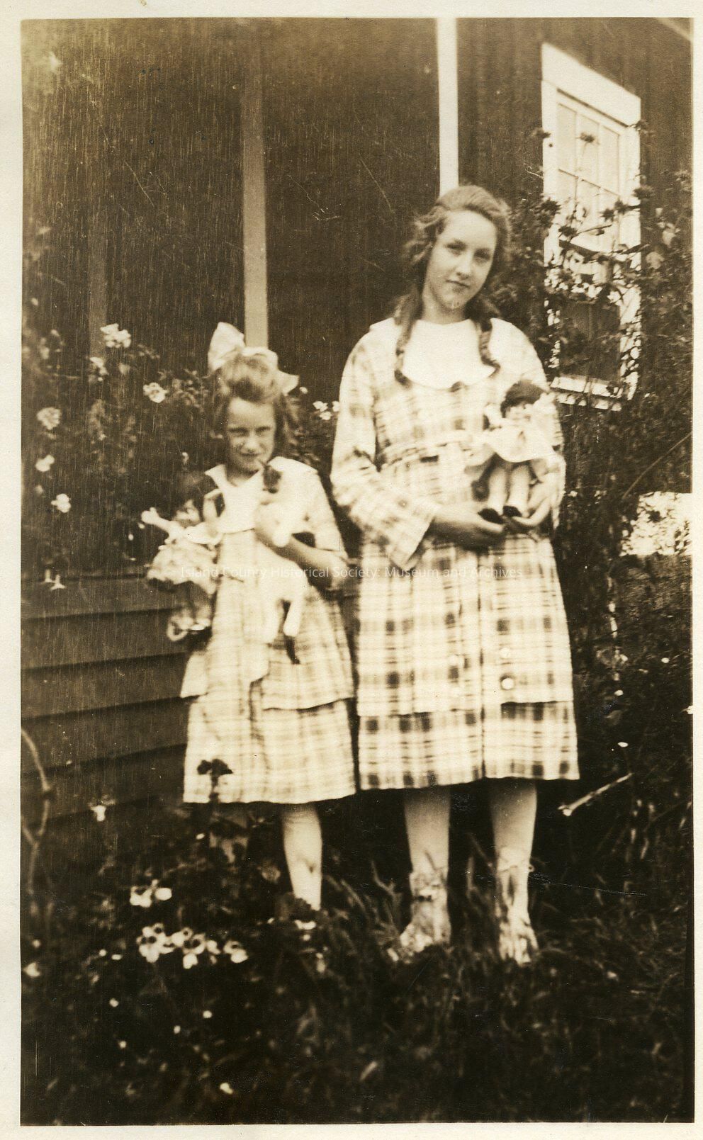 A photo of a woman and a young girl holding dolls outside a house. On the back is handwritten "Harvey and Ted Hill families, Phyllis and Loretta ?