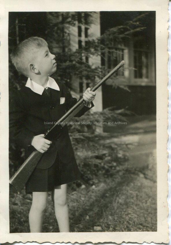 A photo of a young boy holding on a gun looking towards the sky. Robin Currier (Kellogg)