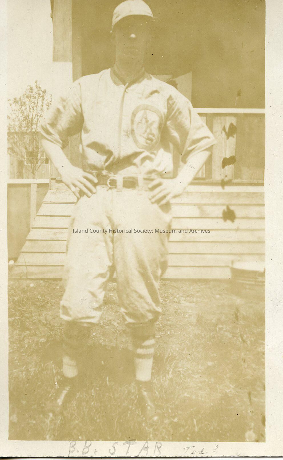 A photo of a man in a baseball outfit with his hands on his hips. Handwritten on the front is "B.B. Star Ted?". Handwritten on the back it says "Harold Hill".Made/Created