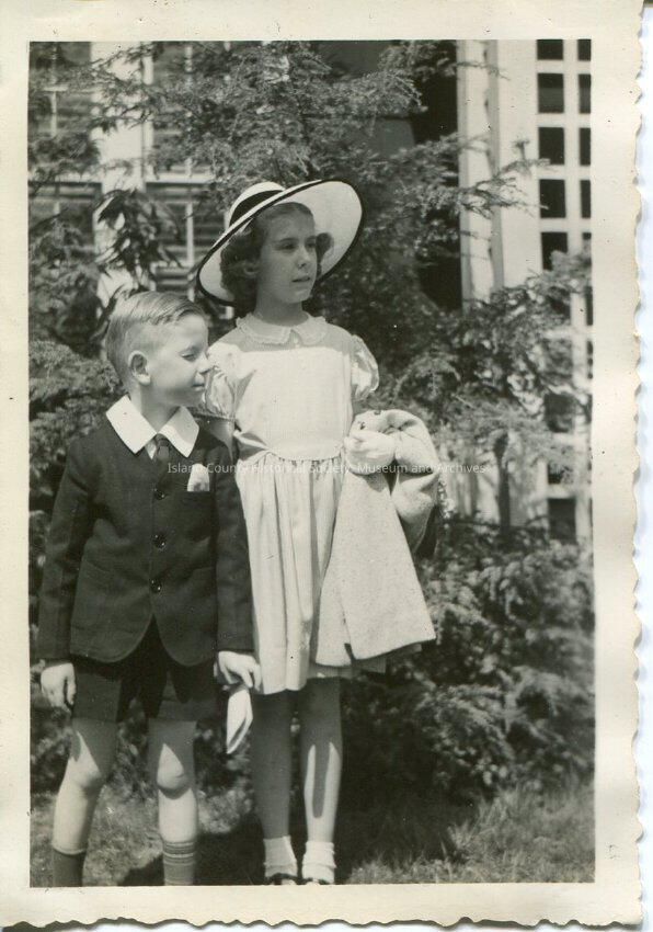 A black and white photo of two young children. There is a boy and a girl and they are both dressed in nice clothing. The boy is wearing a suit jacket and shorts and the girl is wearing a white dress, hat and gloves. They are standing next to each other (siblings?). The background is part of a house.