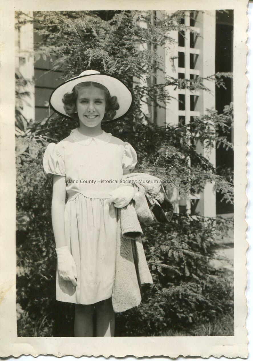 A black and white photo of a young girl. She is wearing a white dress, hat and gloves and is smiling at the camera. She also has a jacket in her arms and her hair is curled. The background is a tree and part of a house.