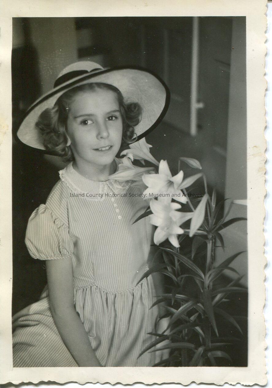 A black and white photo of a young girl posing next to a few lilies. The girl is wearing a striped dress and also has on a sunhat.