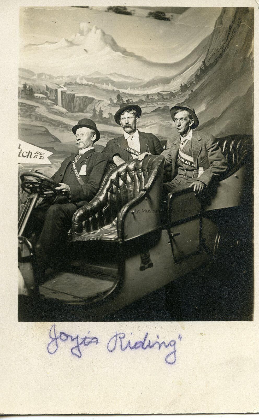 A photo of three men in old car with background. Handwritten on the front says "Joy Riding". Handwritten on the back is "R. Harvey Hill."Made/Created