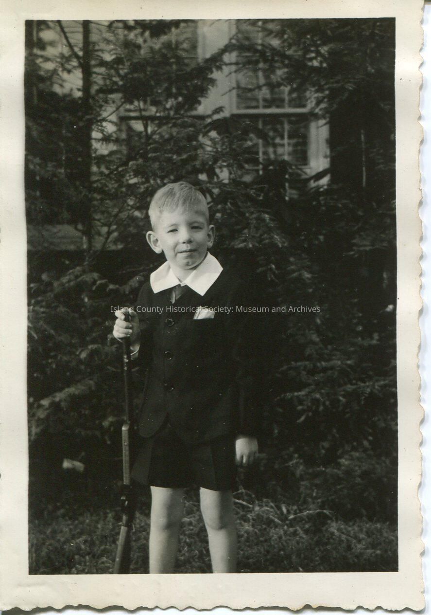 A black and white photo of a young boy posing with a gun. The boy is standing in front of a couple trees and has the butt of the gun on the ground. He's wearing a suit jacket and black shorts. There is part of a house visiable in the background.