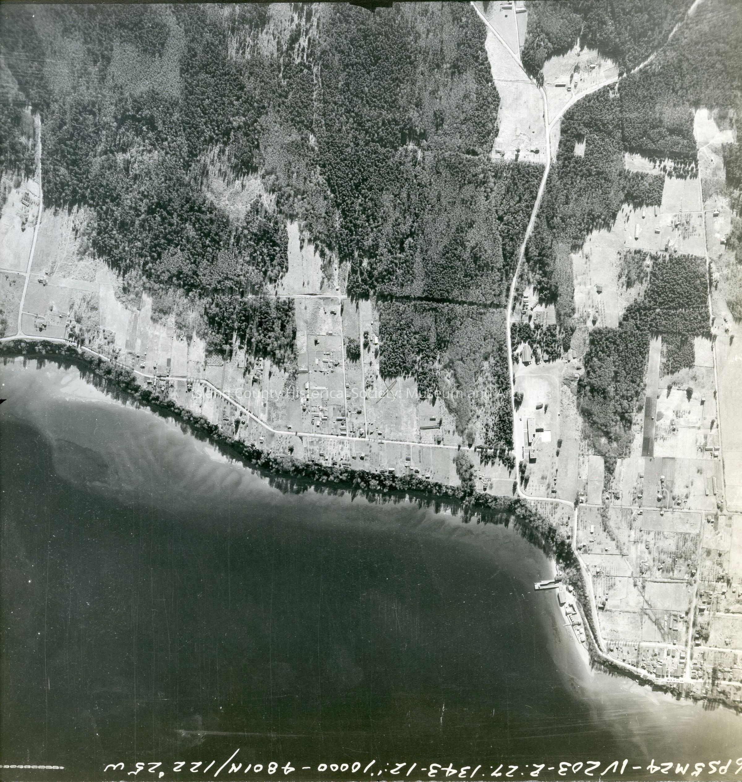Langley and surrounding land. Land is on the western side of the photo with Sandy Point to the north. Main road leading to the Langley marina can be seen.