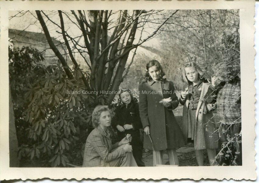 A black and white photo of a small group of people eating hot dogs. There is a couple and three children. The man's face is partically blocked by a tree. The woman on the left-side of the photo is kneeling and has a hot dog in her hand. There is a young boy to the right of the woman and he has goggles on his head. There are two young girls to the boy's right and they are both wearing dresses and jackets and have hot dogs in their hands. It looks to be Autumn in the photo.