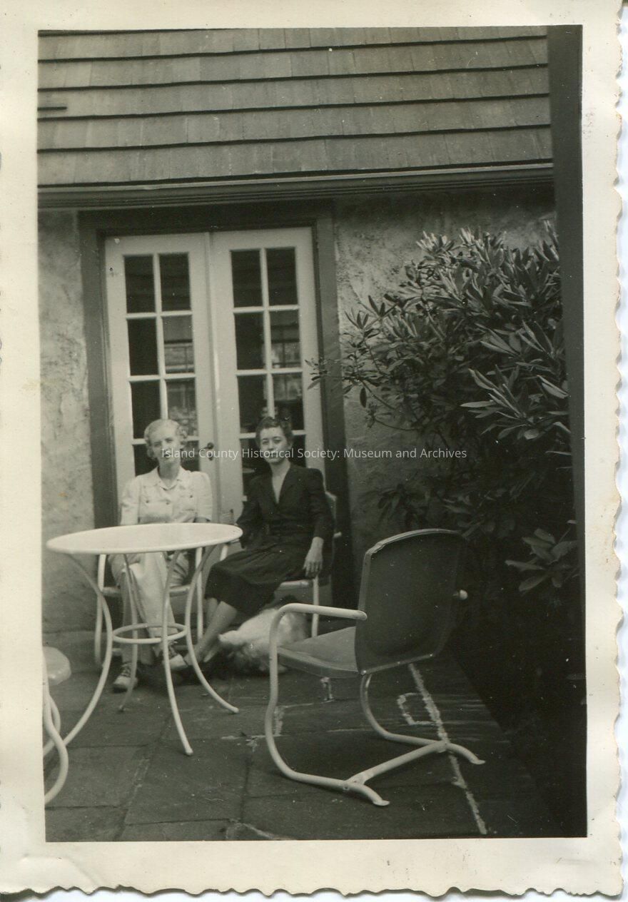 A black and white photo of two women sitting on patio chairs near a house. One woman is wearing a dress and the other is wearing white pants and a white top. There is a dog under one of the chairs. The background is part of a house and a backdoor. The patio furniture is white.